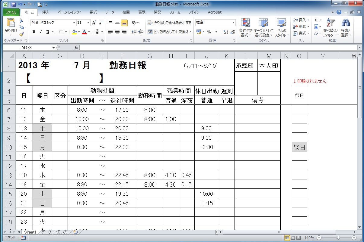 このような勤務タイムシートを作って、土日、祭日、休日振替に色を付けた「条件付き書式」設定なのですが、これをGoogleドライブにアップし、再度ダウンロードしたところ、 あるセルだけ色がつかないことに気が付きました。